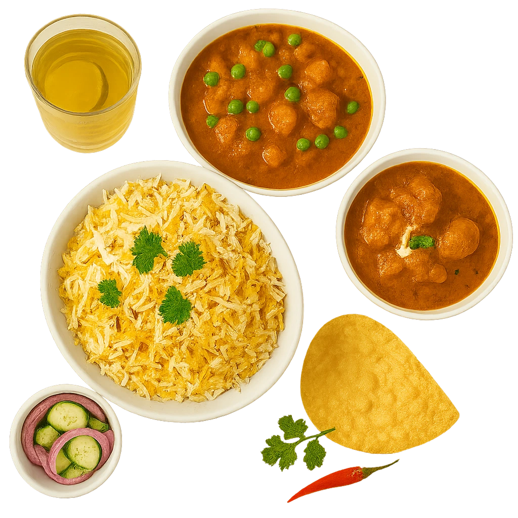 A wholesome mix of flavorful curries, aromatic rice, and sides — perfect for a complete meal.